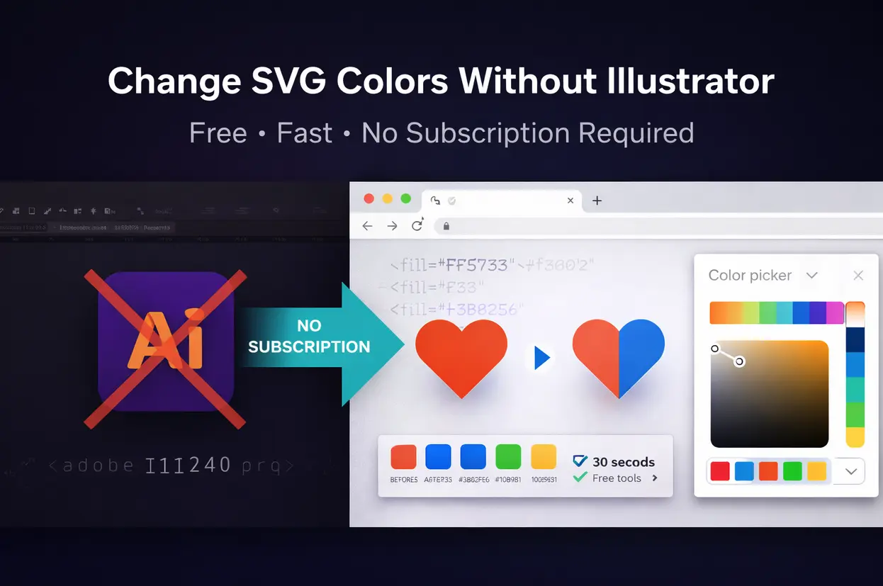 Learn how to change SVG colors instantly using free online tools, no Adobe Illustrator subscription required. This guide covers five different methods: browser-based editors, code editing, bulk color replacement, CSS styling, and AI-powered tools. You'll discover how to modify single colors, swap entire palettes, update gradients, and apply brand colors to downloaded SVG files. Perfect for designers, developers, marketers, and anyone working with vector graphics who needs quick color changes without expensive software.