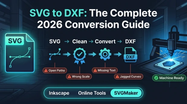 - Three main methods exist: Inkscape (free, manual), online converters (fast, low precision), and SVGMaker's dedicated SVG to DXF converter for cleaner, more reliable output.