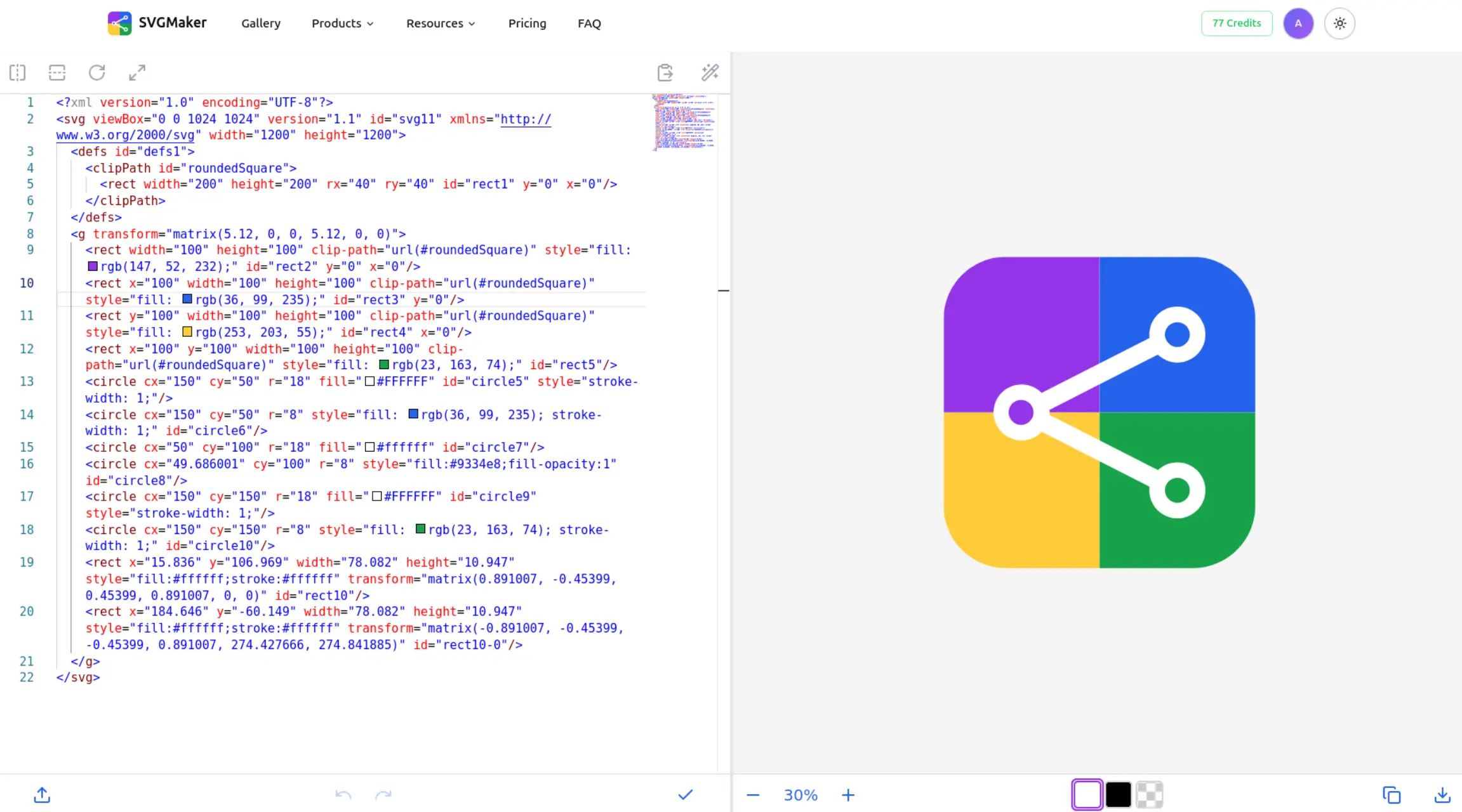 Make your changes in the code editor on the left while watching the preview update on the right. Use the zoom and pan controls to examine details. Apply transforms with the toolbar buttons. Format your code with one click when you're ready to clean it up.